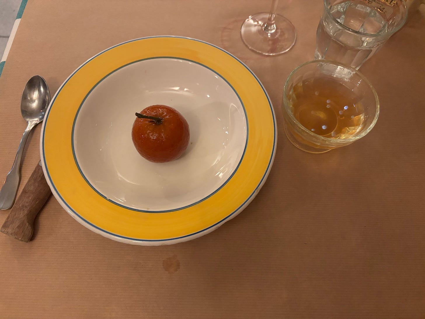 Later that day, after Haider Ackermann’s Tom Ford (which I think changed my life? I walked differently the next morning), I took myself out to dinner. I went to a Corsican restaurant that’s become a favorite of mine, and ate mushroom salad and cuttlefish. The dessert I always order – my favorite dessert in Paris, which means the world – is a clementine soaked in brandy. You eat the whole thing, peau and all. Then you sip the brandy from the cup. It is absolutely bonkers, and was just the weird sensual treat I needed after that sexy alien show from Ackermann.