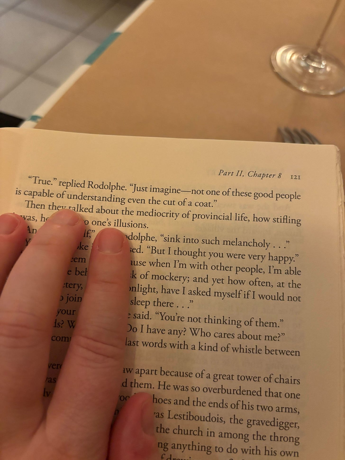 I am reading “Madame Bovary,” because I need something classic and steadfast while fashion and society are getting spun upside-down. I love how Flaubert keeps describing the blood moving under Madame B’s pale skin, and how many characters, deplorable and tender both, are worried about living a boring, pedestrian life. It’s crazy that that was the great anxiety of the 19th-century French countryside: What is the meaning of my life, if it goes on day after day, with nothing new? And these people didn’t even have TikTok!